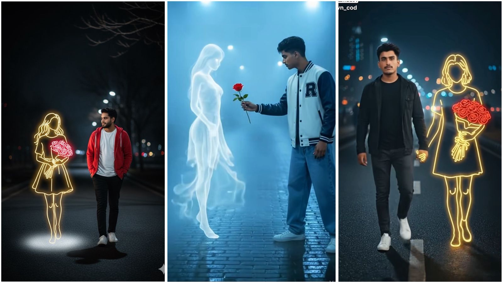 Beside him appears a Golden glowing, neon-style illustration of a girl holding a bouquet of bright red roses. The neon girl emits a soft white light, contrasting against the dark, blurry background of city lights in the distance. With Boy white T-shirt and black pent The atmosphere feels calm, melancholic, and slightly surreal, blending reality and imagination. 100% accurate my face.